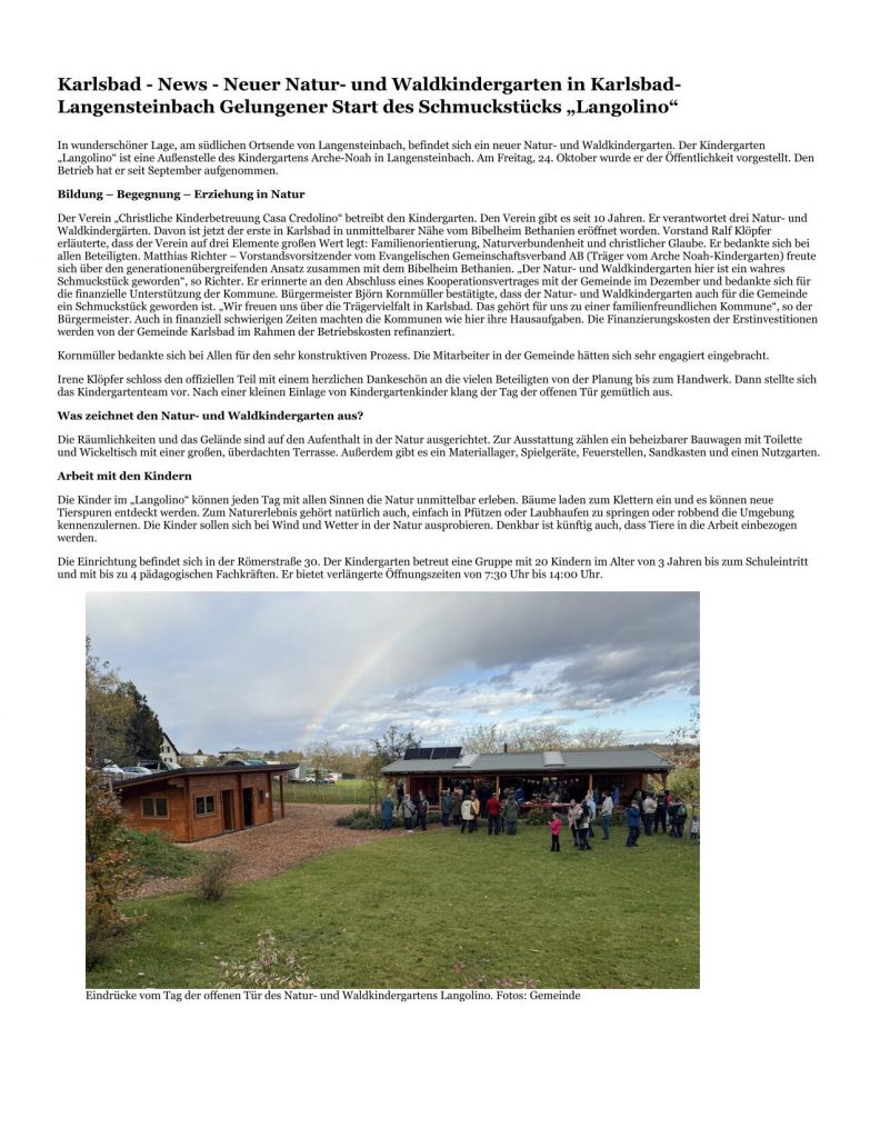 In wunderschöner Lage, am südlichen Ortsende von Langensteinbach, befindet sich ein neuer Natur- und Waldkindergarten. Der Kindergarten „Langolino“ ist eine Außenstelle des Kindergartens Arche-Noah in Langensteinbach. Am Freitag, 24. Oktober wurde er der Öffentlichkeit vorgestellt. Den Betrieb hat er seit September aufgenommen.